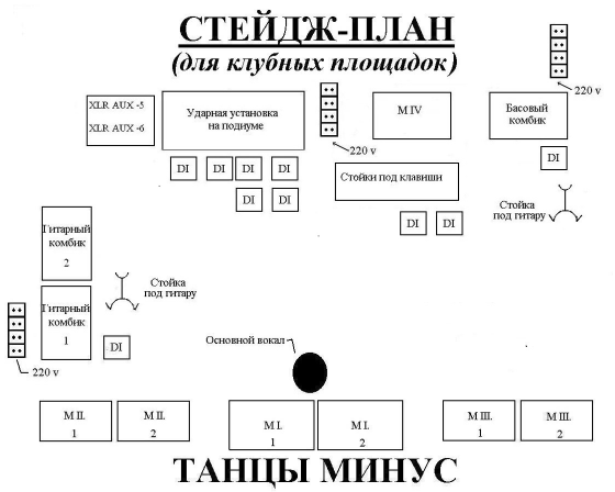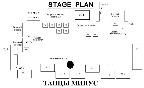 На сцене должны находиться 8 мониторов мощностью 400 - 500 Wt. каждый и 2 стерео прострела мощностью 2,0 kW каждый.